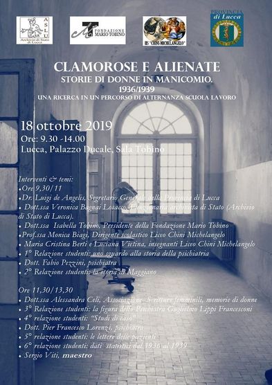 Si segnala che venerdì 18 ottobre, nella Sala Tobino di Palazzo Ducale a Lucca, dalle ore 9:30 alle ore 14:00, si terrà la presentazione del progetto di alternanza scuola-lavoro dal titolo "Clamorose ed alienate. Storie di donne in manicomio. 1936-1939", svolto presso l'Archivio di Stato di Lucca dagli allievi delle classi 4b e 4d del Liceo delle Scienze Umane dell'Istituto Chini-Michelangelo di Lido di Camaiore.