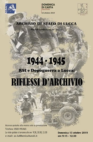 In occasione della Domenica di Carta 2019 e per celebrare i 75 anni dalla Liberazione della città, l’Archivio di Stato di Lucca propone la mostra documentaria 1944-1945. RSI e Dopoguerra a Lucca: riflessi d'archivio, un percorso documentario attraverso il suo patrimonio contemporaneo, alla ricerca delle testimonianze sui fatti e sui protagonisti che dall'inizio del movimento partigiano portarono alla Liberazione ed al difficile processo di epurazione dell'immediato Dopoguerra.